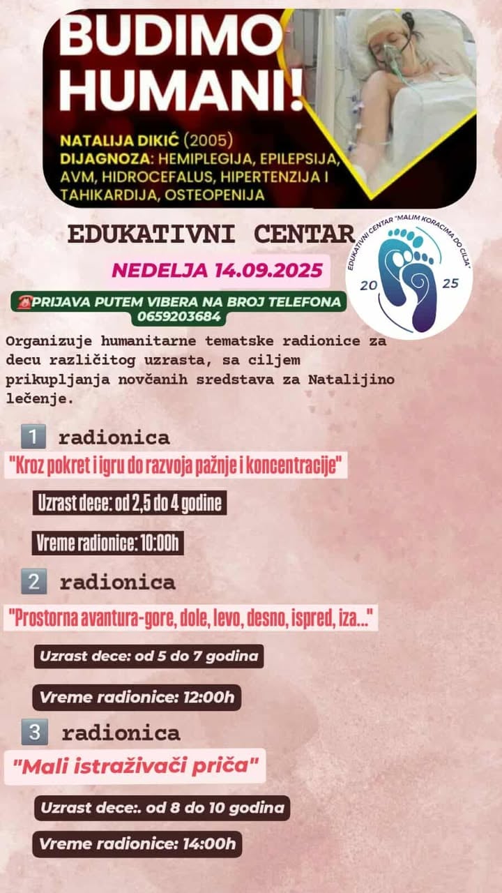 Edukativni centar “Malim koracima do cilja” iz Aleksinca u nedelju 14. septembra organizuje humanitarne radionice za decu različitog uzrasta, a sav prihod namenjen je za lečenje Natalije Dikić.