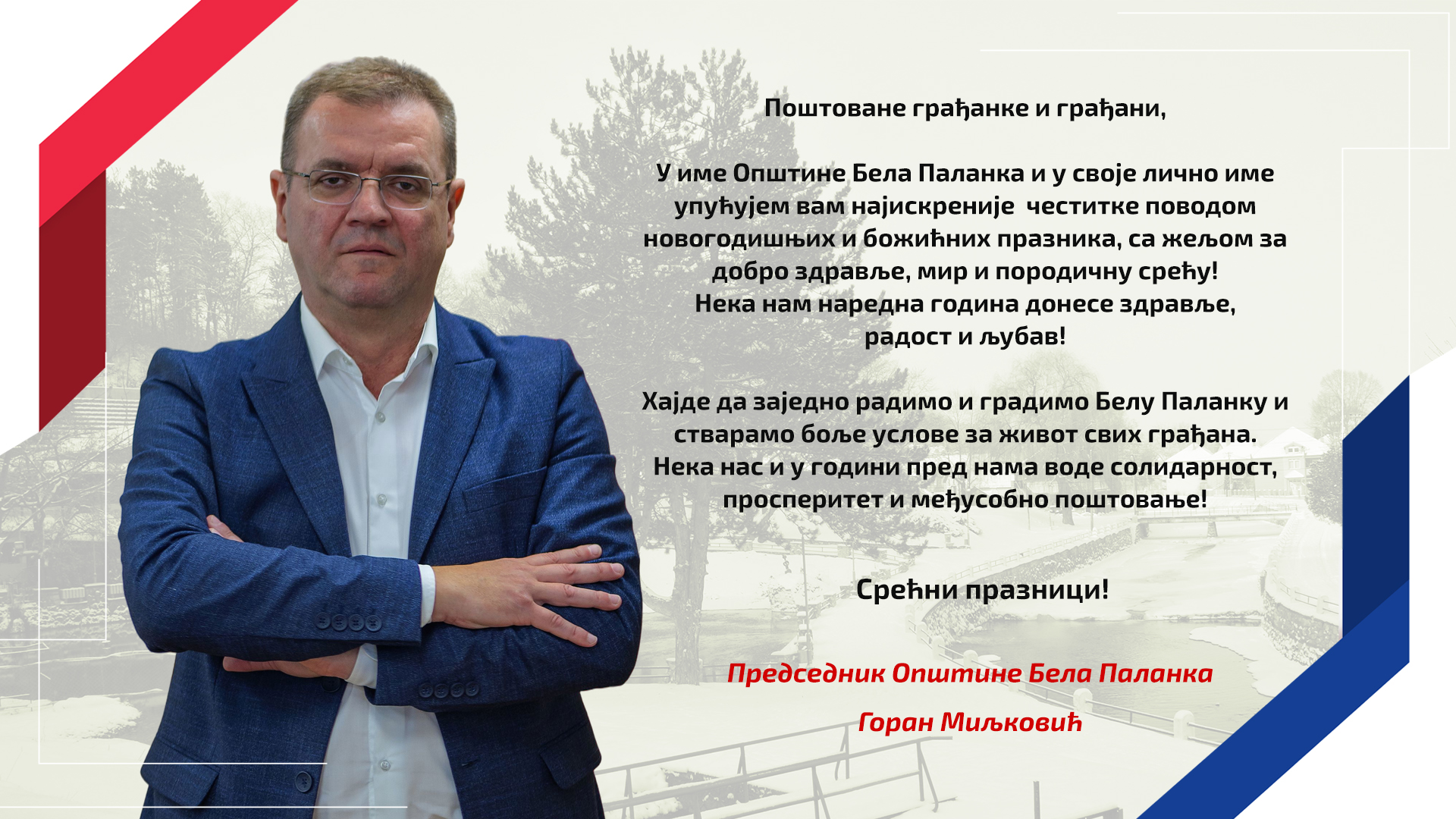 Poštovane građanke i građani, u ime Opštine Bela Palanka i u svoje lično ime upućujem vam najiskrenije čestitke povodom novogodišnjih i božićnjih praznika. Neka nam naredna 2026. godina donese zdravlje, radost i ljubav. Hajde da zajedno radimo i gradimo Belu Palanku i stvaramo bolje uslove za život svih građana. Neka nas i u godini pred […]